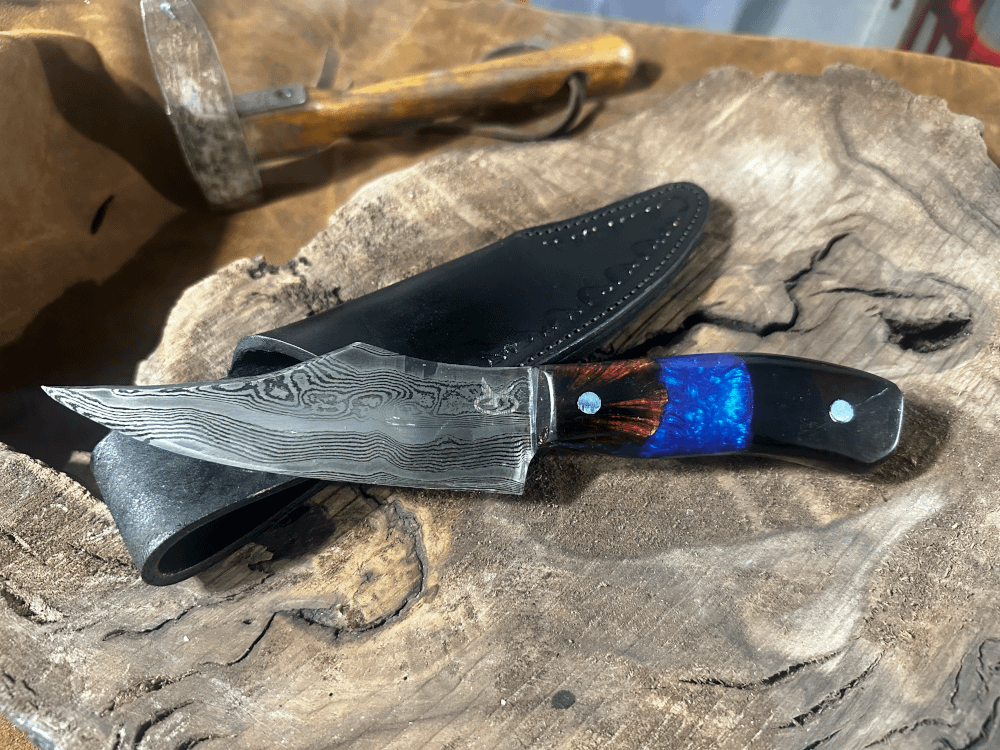 The handle is Stabilized Manzanita Burl Hybrid Resin.